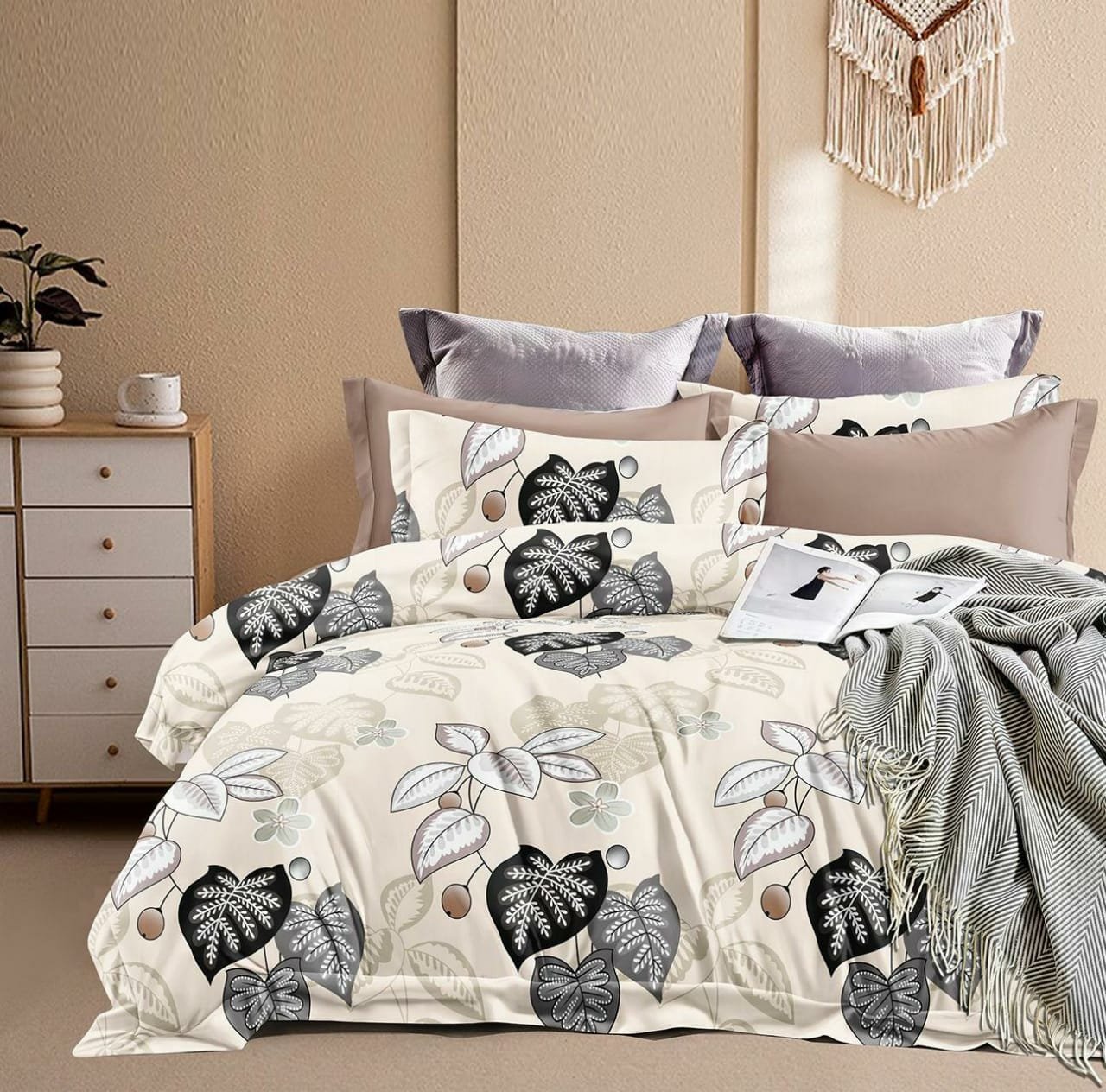 Elegant Leaf Print Double Bed Bedsheet – Cream & Black Design with 4 Pillow Covers
