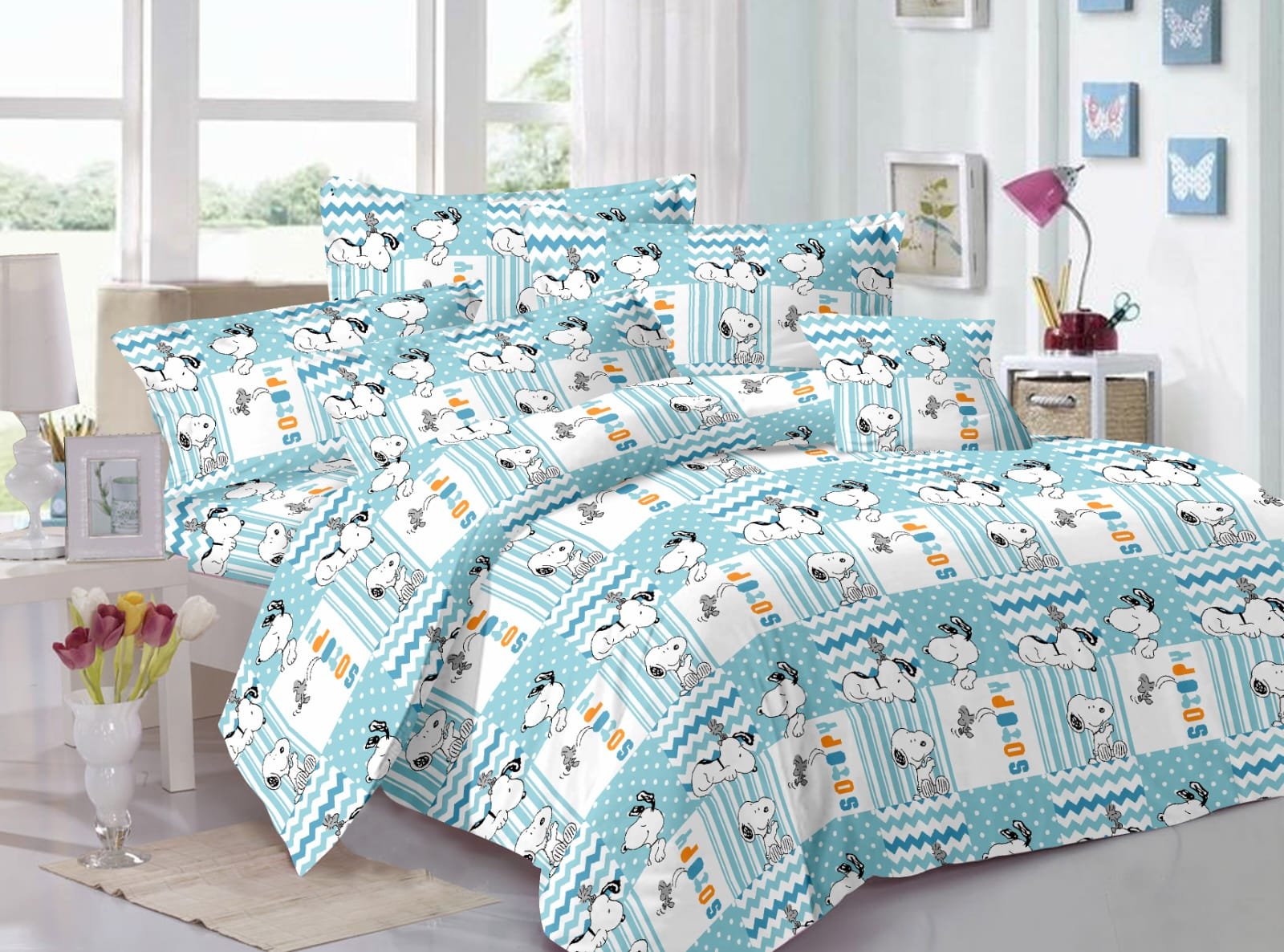 Kids Cartoon Dog Print Double Bed Bedsheet – Blue Patchwork Design with 2 Pillow Covers