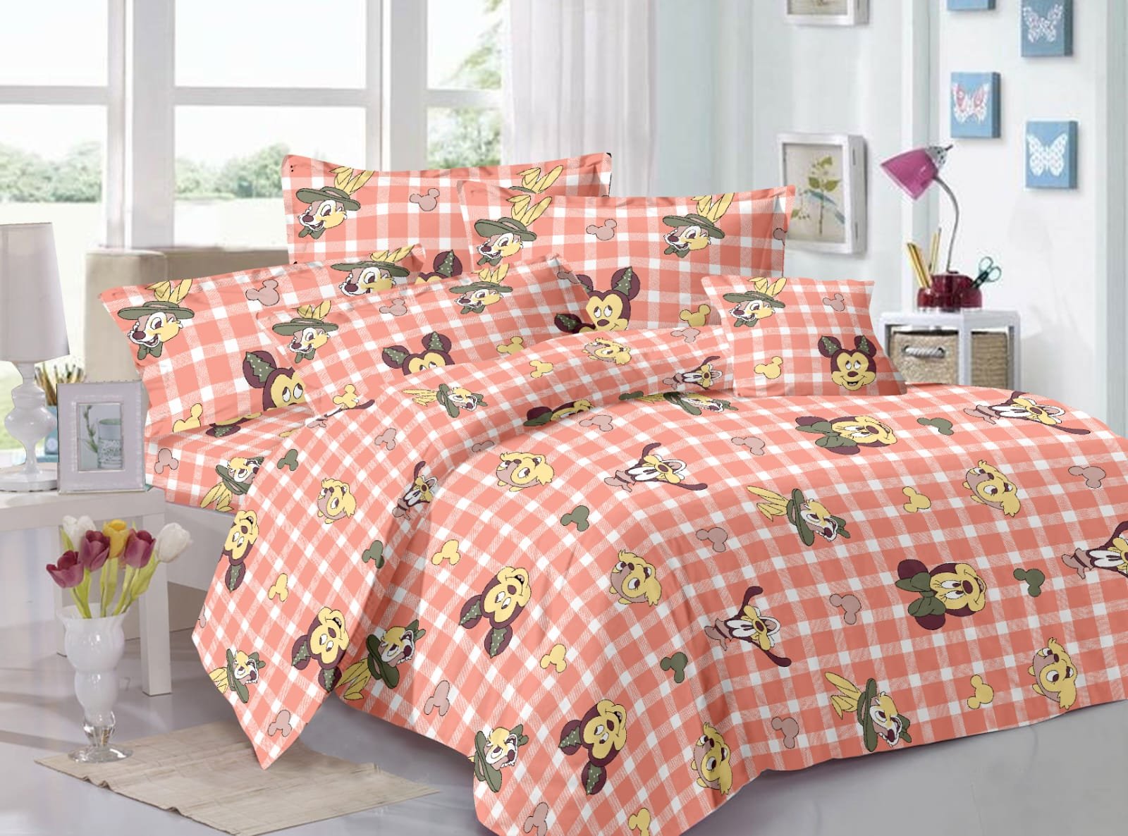 Kids Cartoon Print Double Bed Bedsheet – Peach Check Design with 2 Pillow Covers