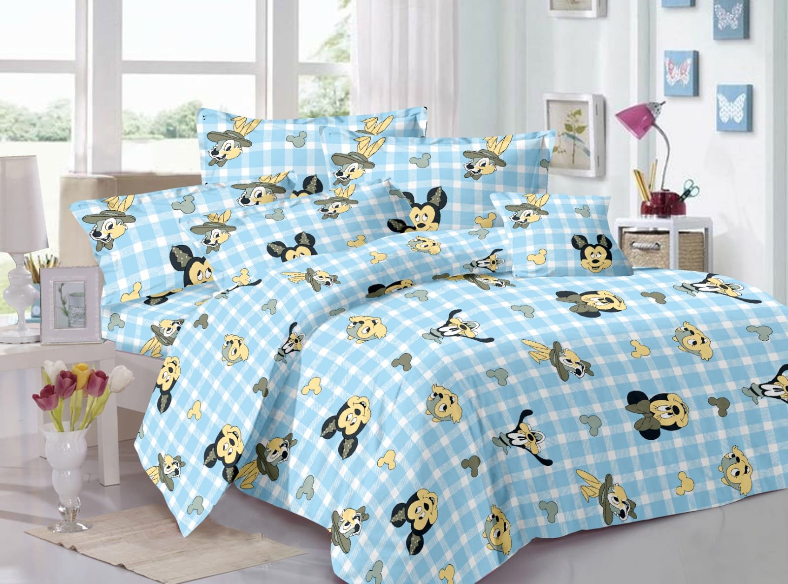Kids Cartoon Print Double Bed Bedsheet – Soft Blue Check Design with 2 Pillow Covers